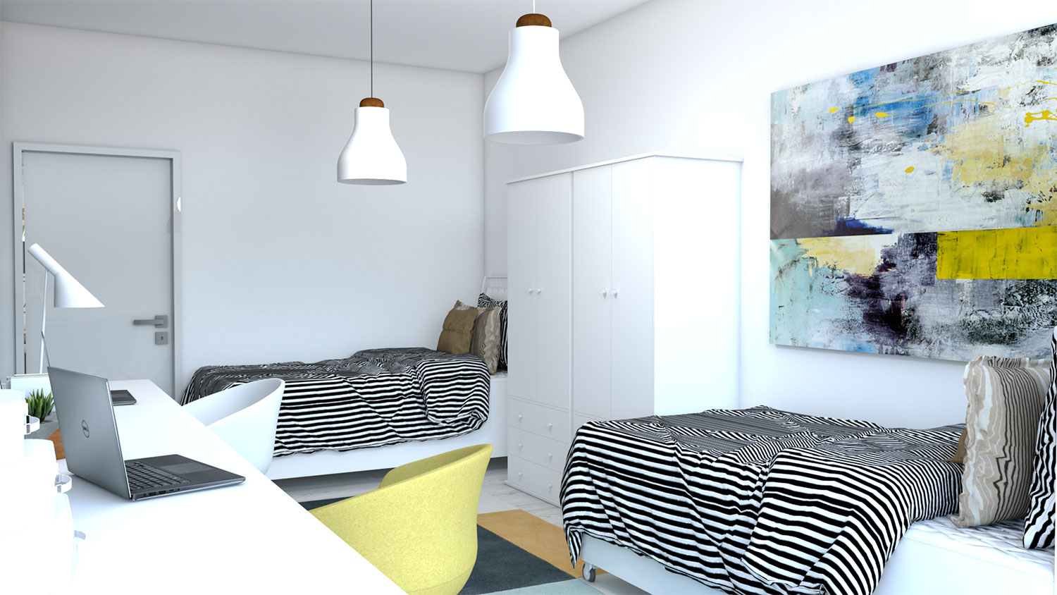 Zaujímavá dispozícia 2,5 izbového bytu nám dovolila vytvoriť nevšedný koncept. Komoru pri vstupe sme rozšírili na úkor obývačky a vytvorili z nej ďalšiu spálňu. Keďže v nej nieže klasické okno, svetlo aj vetranie sme zabezpečili podlhovastým vyklápacím svetlíkom. Byt je určený na prenájom pre študentov. Použité materiály sú preto odolné, farby pestré a hravé. Sedenie je v kuchyni plánované barové s výhľadom na televízor. Po čase ho nebude problém vymeniť za jedálenský stôl. Výklenok pri vstupných dverách sme využili ako šatník. Vytvorili sme ho z dreveným priečok ako polootvorený priestor. Tie sa ťahajú až do chodby, čo priestor opticky rozširuje.